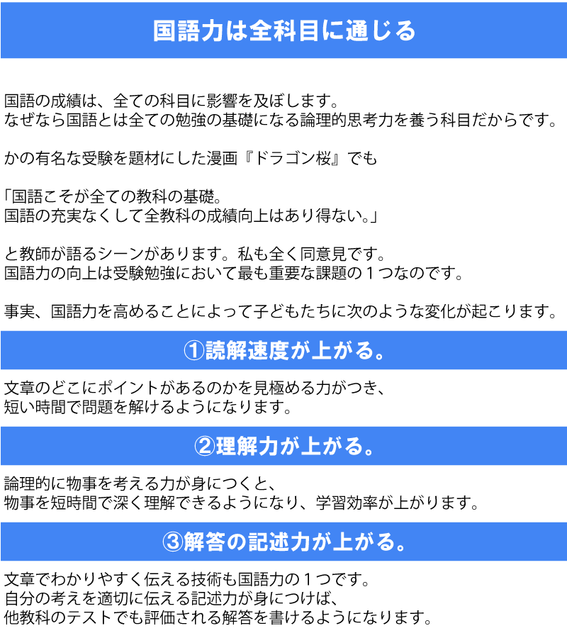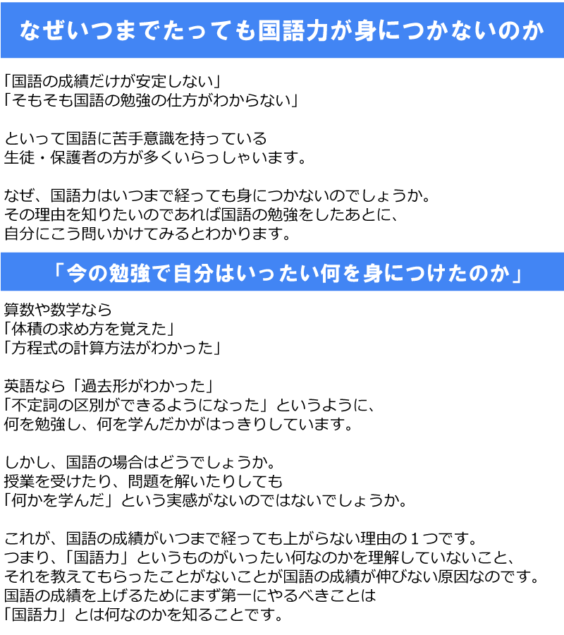 多くの子が国語で苦しむのは、能力が足りないからではありません。ただ、「正しい読み方・解き方の技術」を知らないだけなのです。