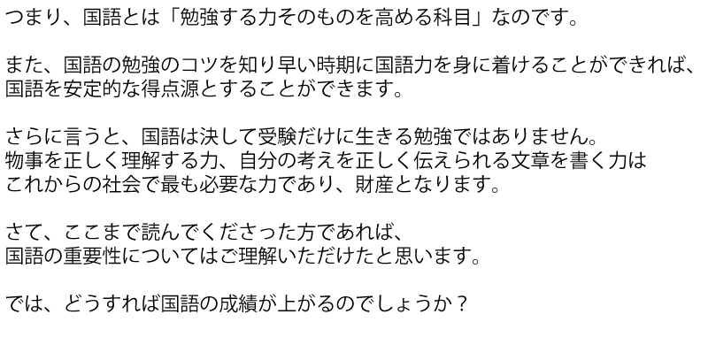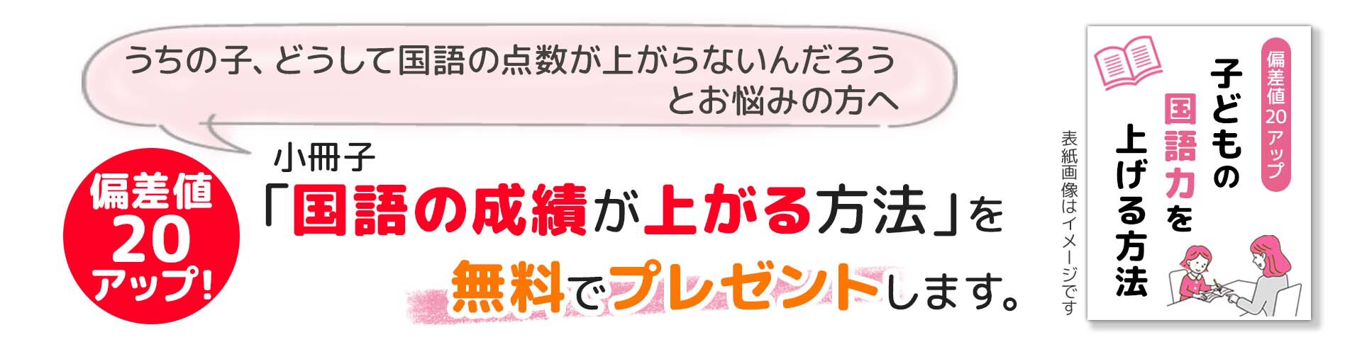 お問い合わせの方に「子どもの国語力を上げる方法」という小冊子を無料で配布しています。この小冊子を読めば、今まで曖昧だった国語に対する認識が変わるはずです。ぜひ「国語力とは何か?」を知り、本当の国語の勉強の仕方を知っていただきたいと思います。